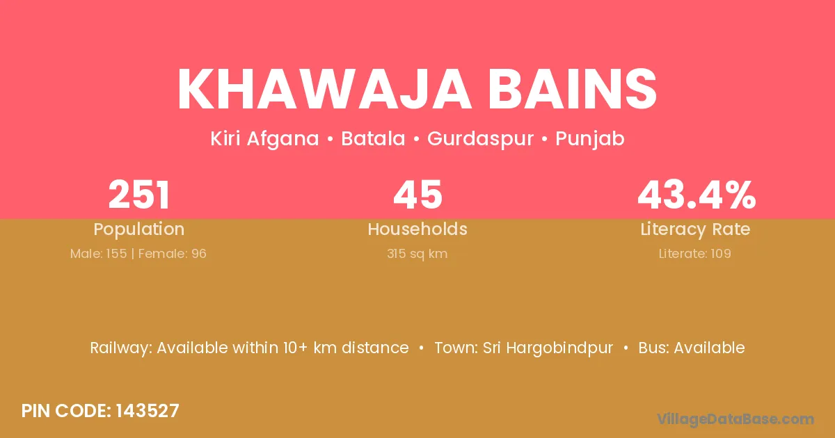 Khawaja Bains village has a total population of 251 people, of which 155 are males and 96 are females.