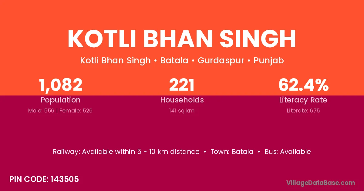 Kotli Bhan Singh village has a total population of 1,082 people, of which 556 are males and 526 are females.