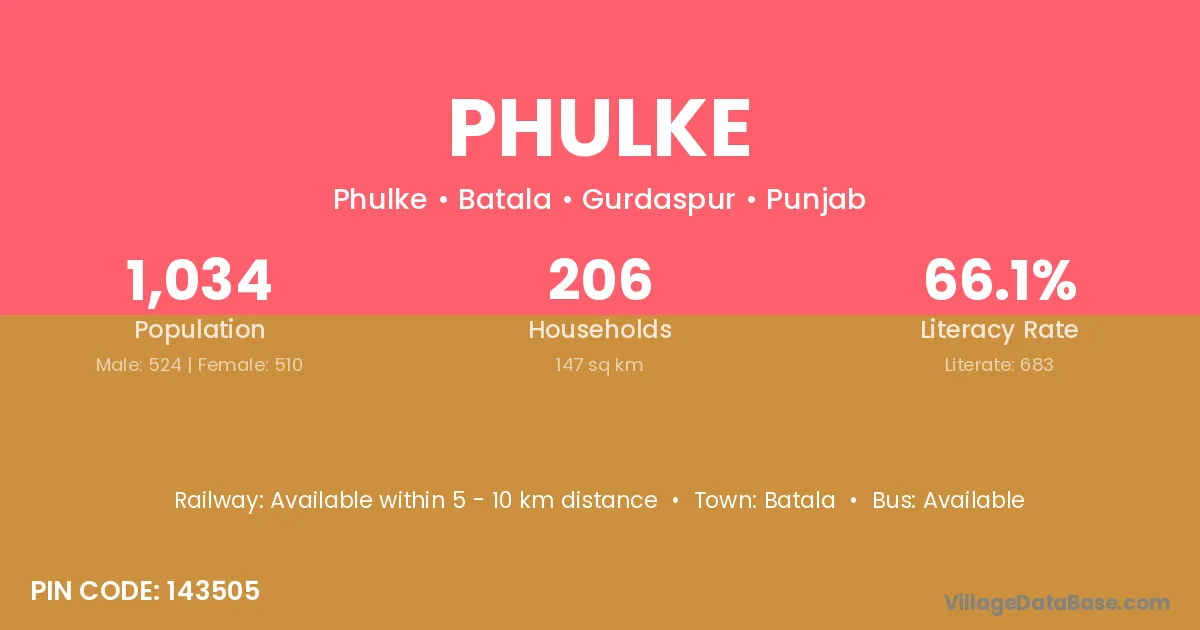 Phulke village has a total population of 1,034 people, of which 524 are males and 510 are females.