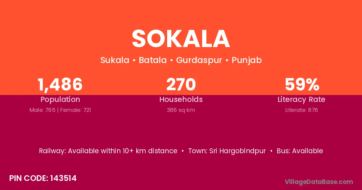Sokala village has a total population of 1,486 people, of which 765 are males and 721 are females.