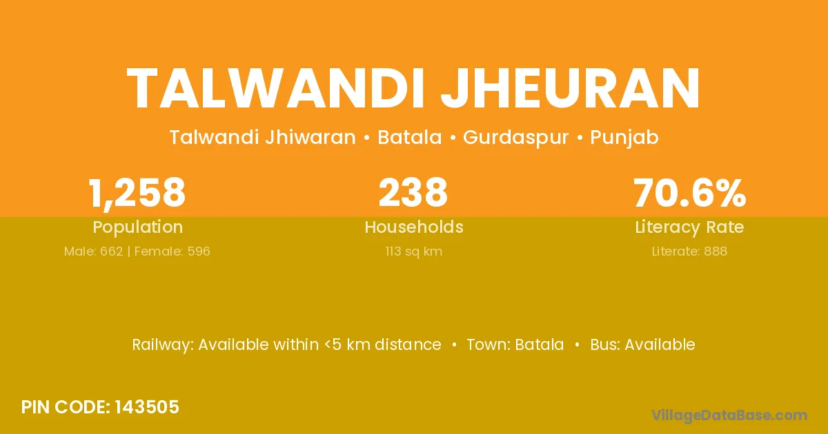 Talwandi Jheuran village has a total population of 1,258 people, of which 662 are males and 596 are females.