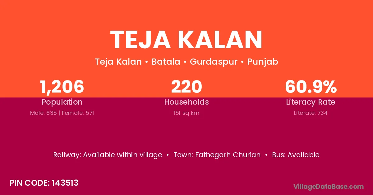 Teja Kalan village has a total population of 1,206 people, of which 635 are males and 571 are females.