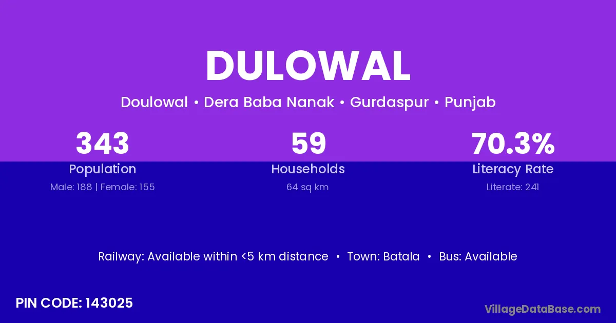 According to Census 2011 information, the village code of Dulowal village is 143025.
