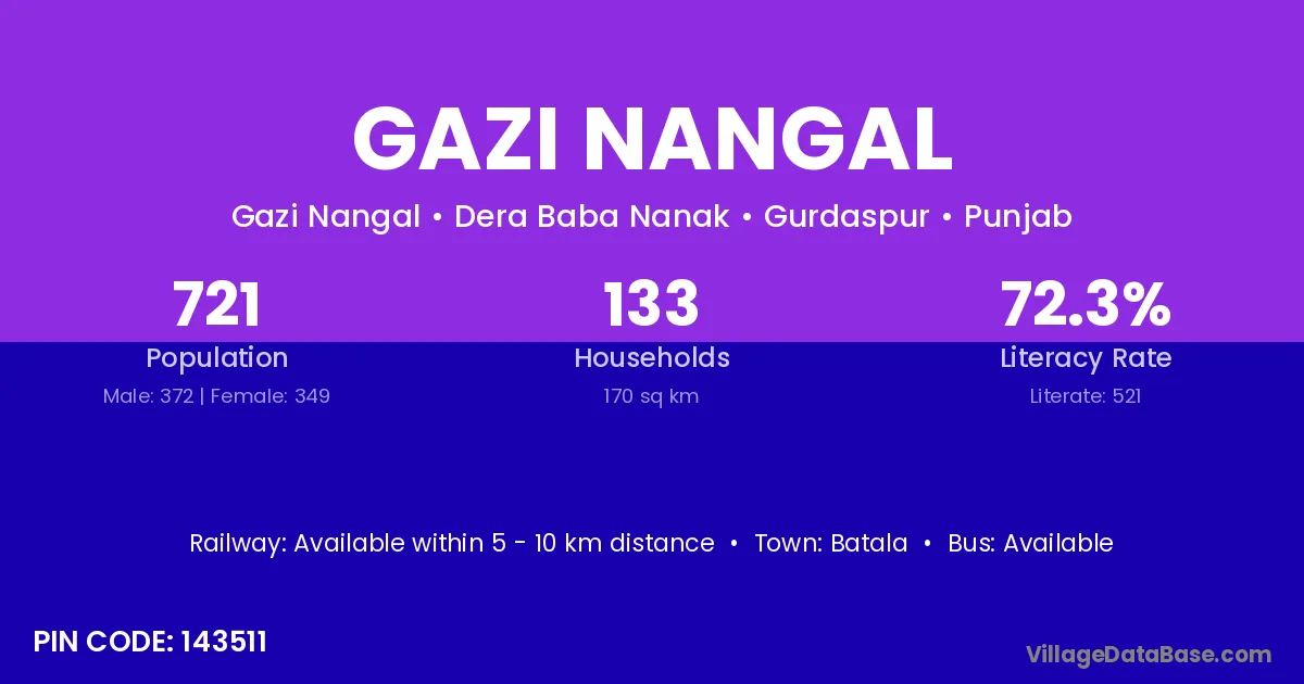 Gazi Nangal village has a total population of 721 people, of which 372 are males and 349 are females.