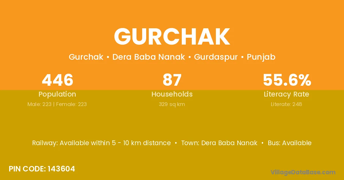 Gurchak village has a total population of 446 people, of which 223 are males and 223 are females.