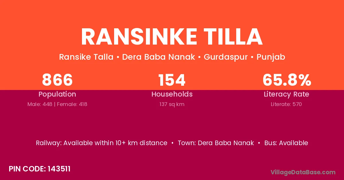 Ransinke Tilla village has a total population of 866 people, of which 448 are males and 418 are females.