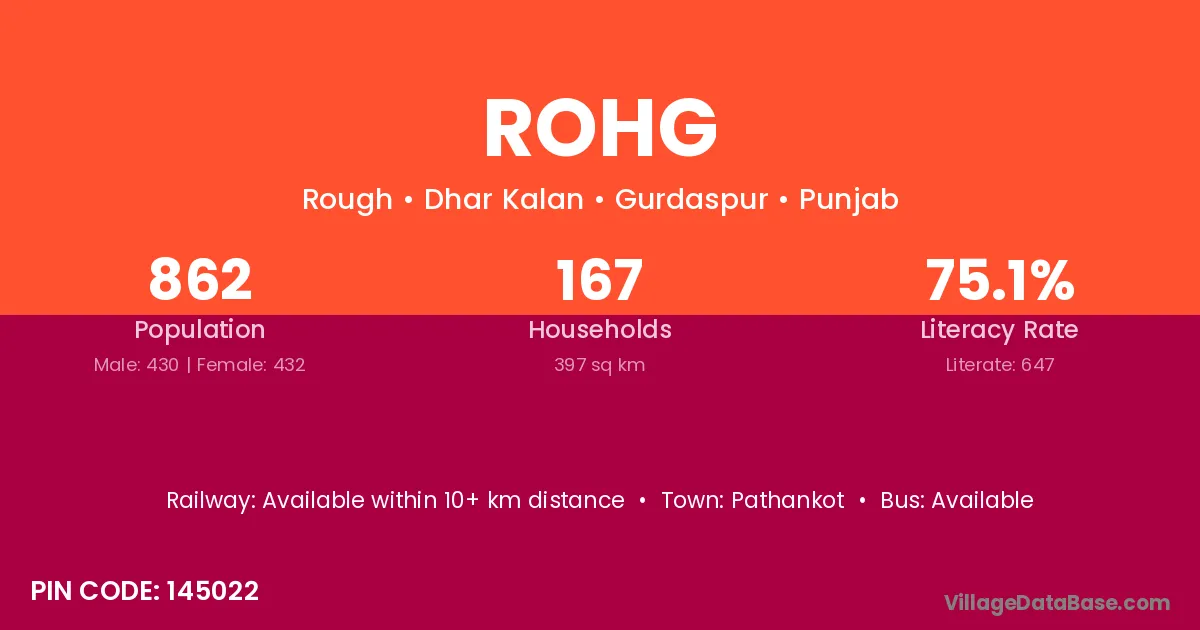 Rohg village has a total population of 862 people, of which 430 are males and 432 are females.