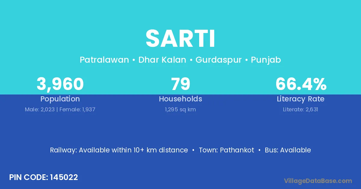 According to Census 2011 information, the village code of Sarti village is 145022.