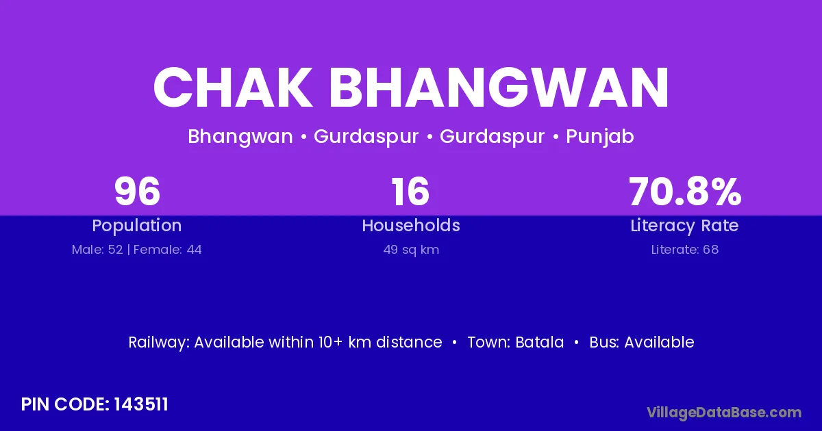 Chak Bhangwan village has a total population of 96 people, of which 52 are males and 44 are females.