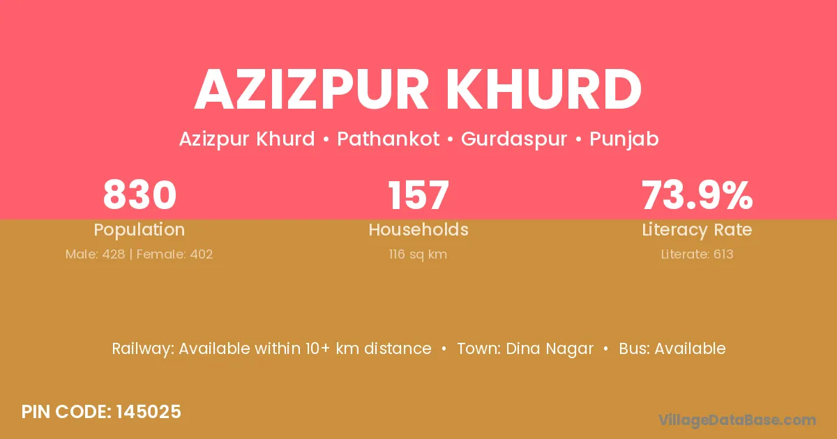 Azizpur Khurd village has a total population of 830 people, of which 428 are males and 402 are females.