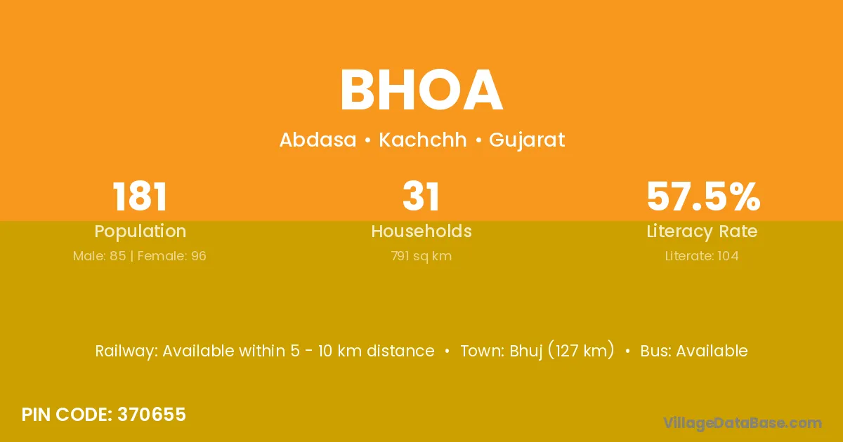 The literacy rate of Bhoa village is 75.81%. Male literacy stands at 79.78% and female literacy at 71.55%.