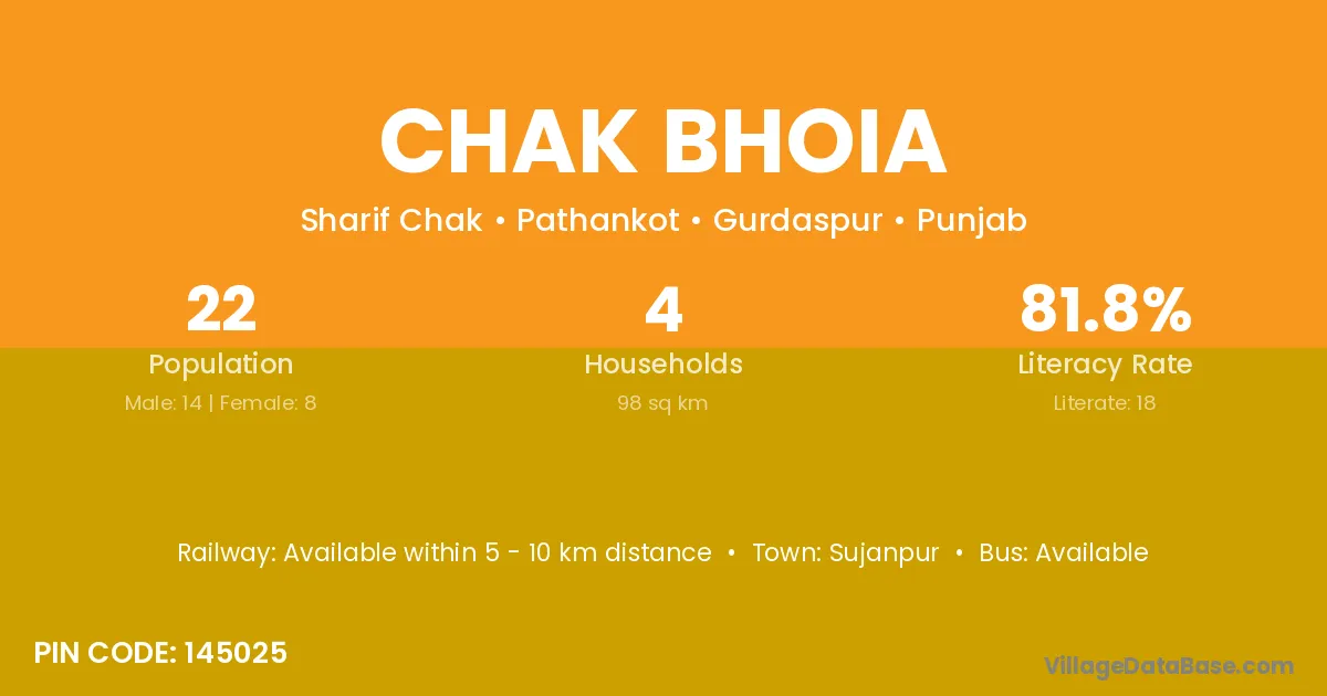 Chak Bhoia village has a total population of 22 people, of which 14 are males and 8 are females.