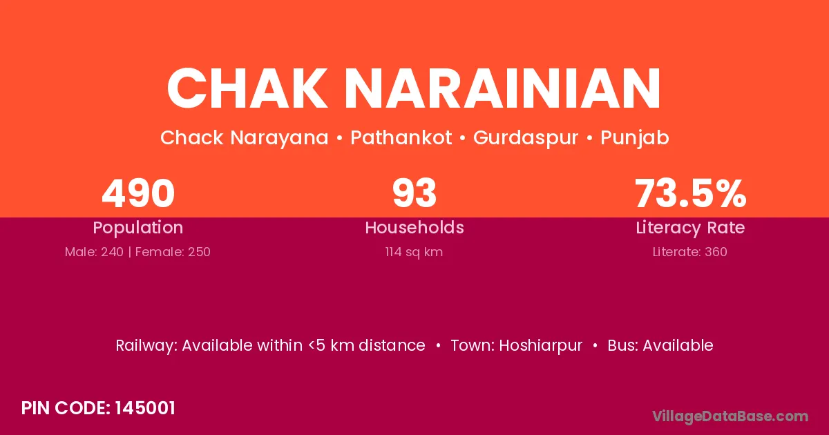 Chak Narainian village has a total population of 490 people, of which 240 are males and 250 are females.