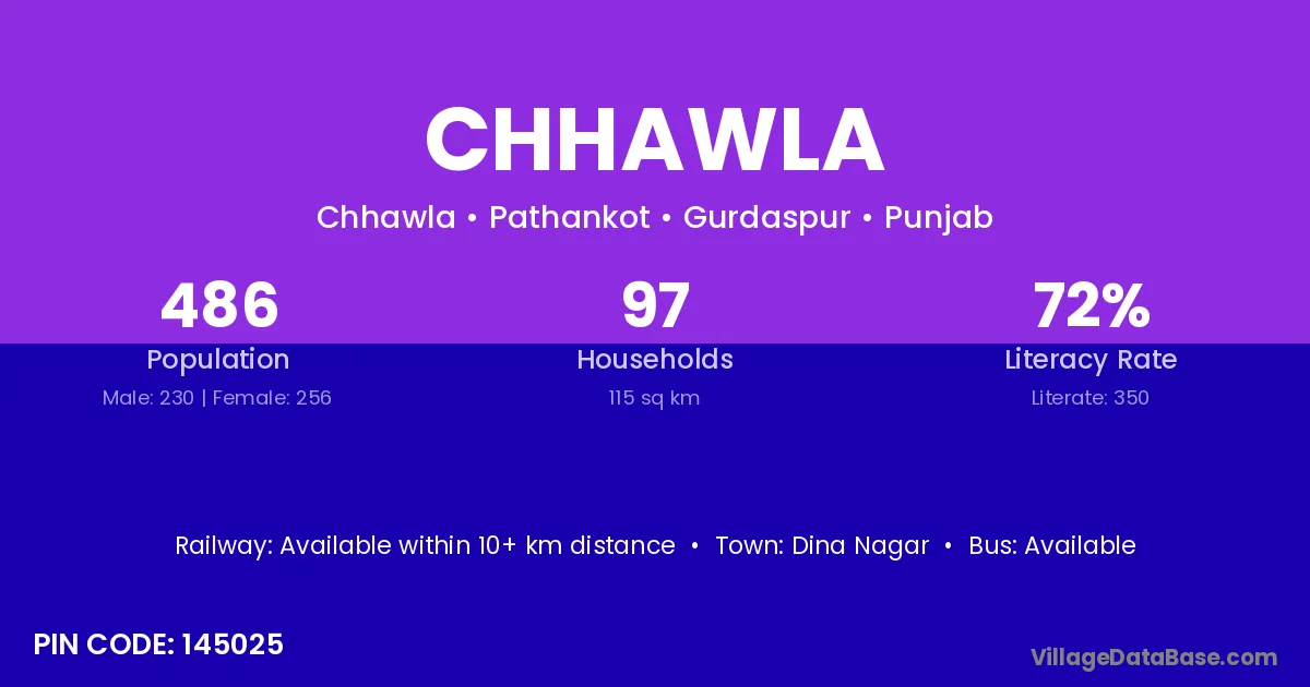 Chhawla village has a total population of 486 people, of which 230 are males and 256 are females.
