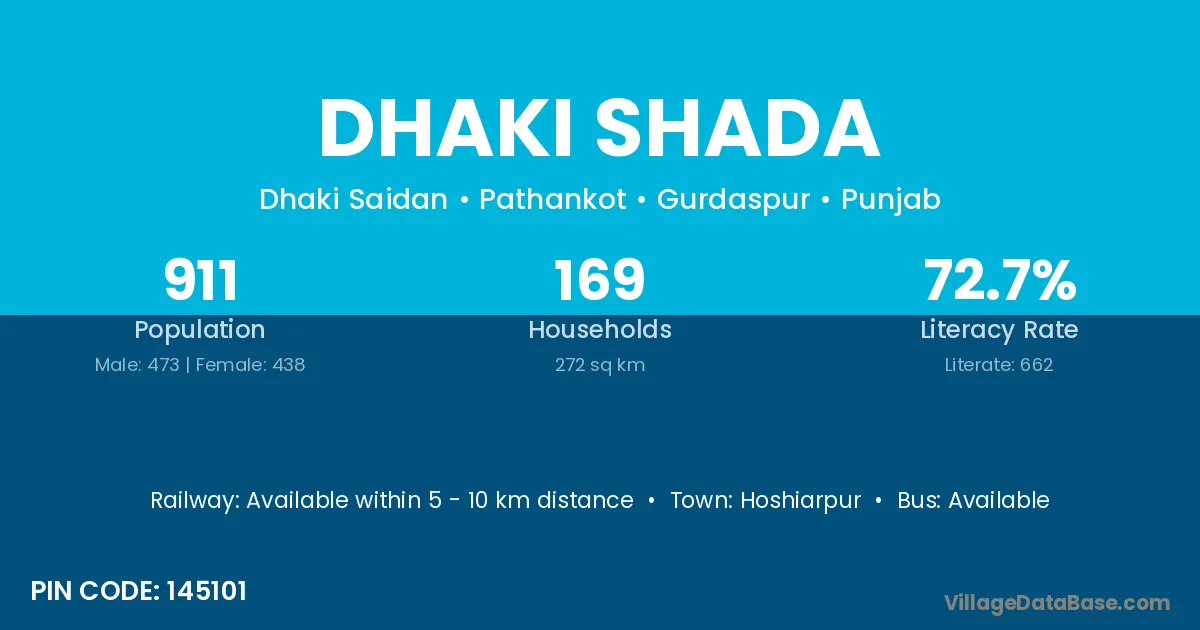 Hoshiarpur is the nearest town to Dhaki Shada village for major economic activities