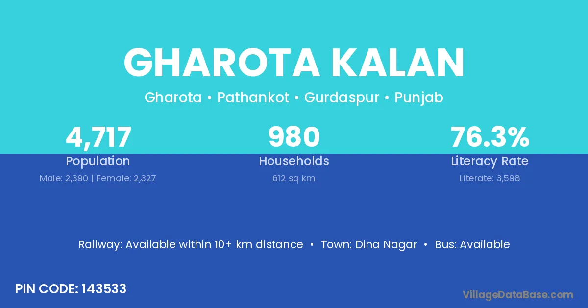 Dina Nagar is the nearest town to Gharota Kalan village for major economic activities