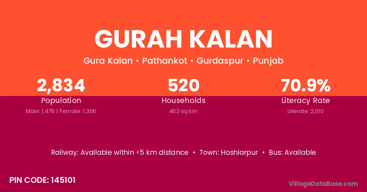 Gurah Kalan village has a total population of 2,834 people, of which 1,478 are males and 1,356 are females.