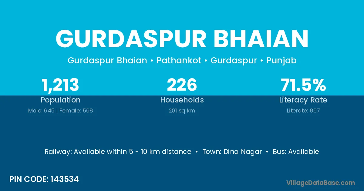 Gurdaspur Bhaian village has a total population of 1,213 people, of which 645 are males and 568 are females.