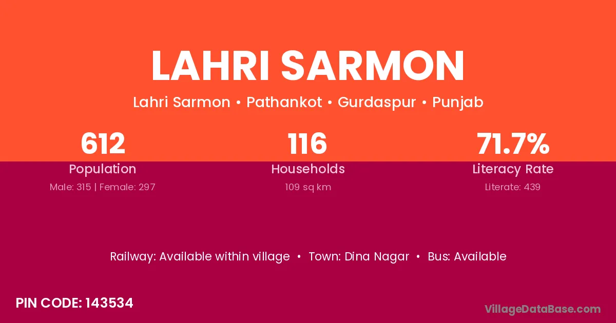 Lahri Sarmon village has a total population of 612 people, of which 315 are males and 297 are females.
