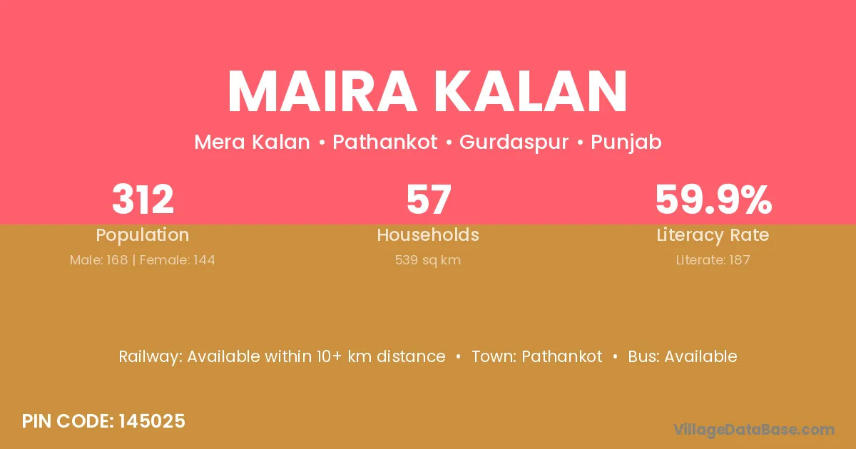 Pathankot is the nearest town to Maira Kalan village for major economic activities