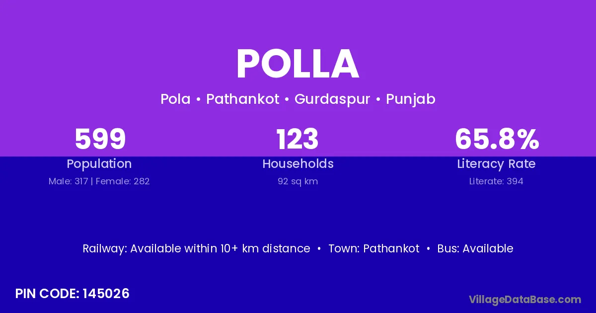 Pathankot is the nearest town to Polla village for major economic activities