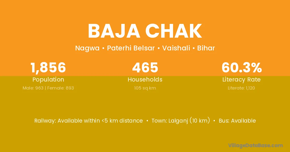 The literacy rate of Baja Chak village is 76.07%. Male literacy stands at 77.61% and female literacy at 74.44%.