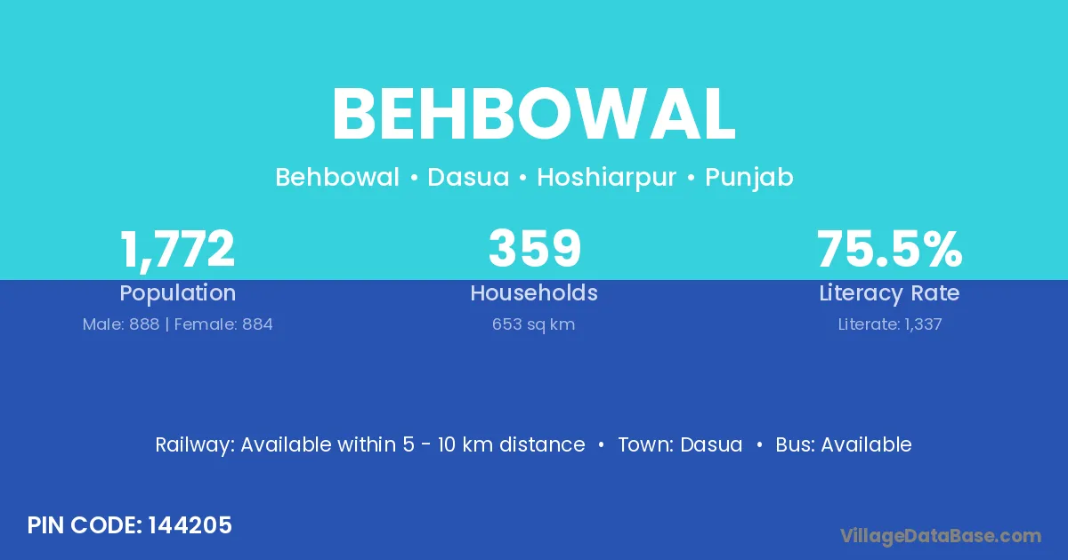 Behbowal village has a total population of 1,772 people, of which 888 are males and 884 are females.