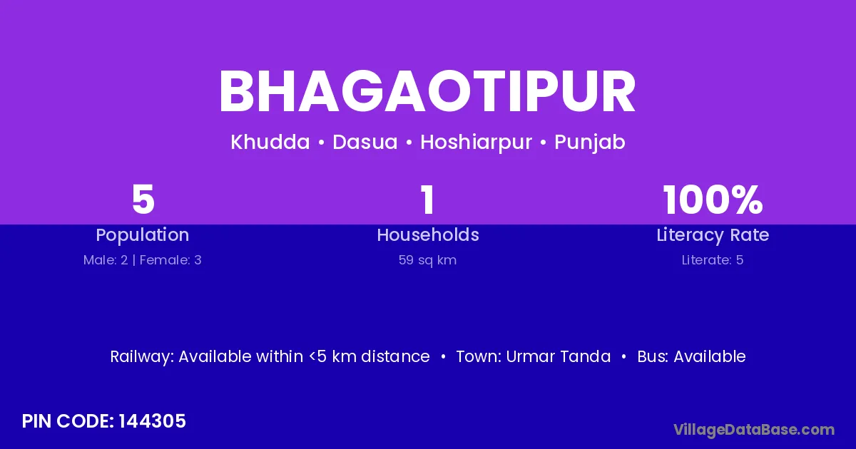 Bhagaotipur village has a total population of 5 people, of which 2 are males and 3 are females.