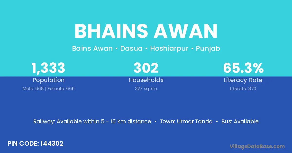 Bhains Awan village has a total population of 1,333 people, of which 668 are males and 665 are females.
