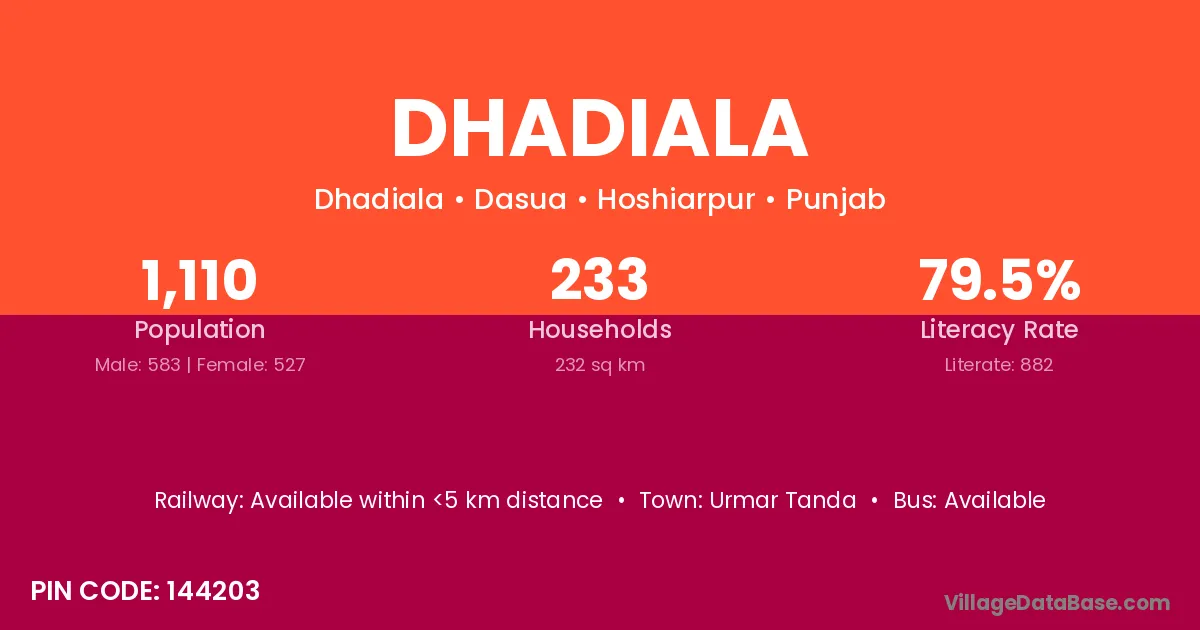 According to Census 2011 information, the village code of Dhadiala village is 144203.