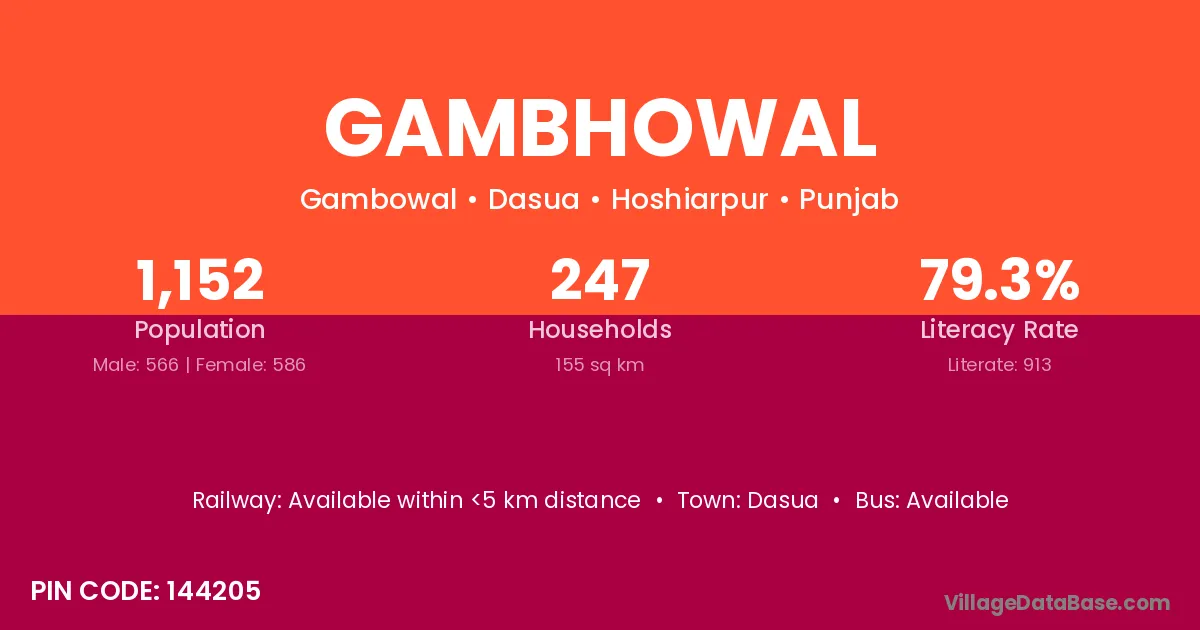 Gambhowal village has a total population of 1,152 people, of which 566 are males and 586 are females.