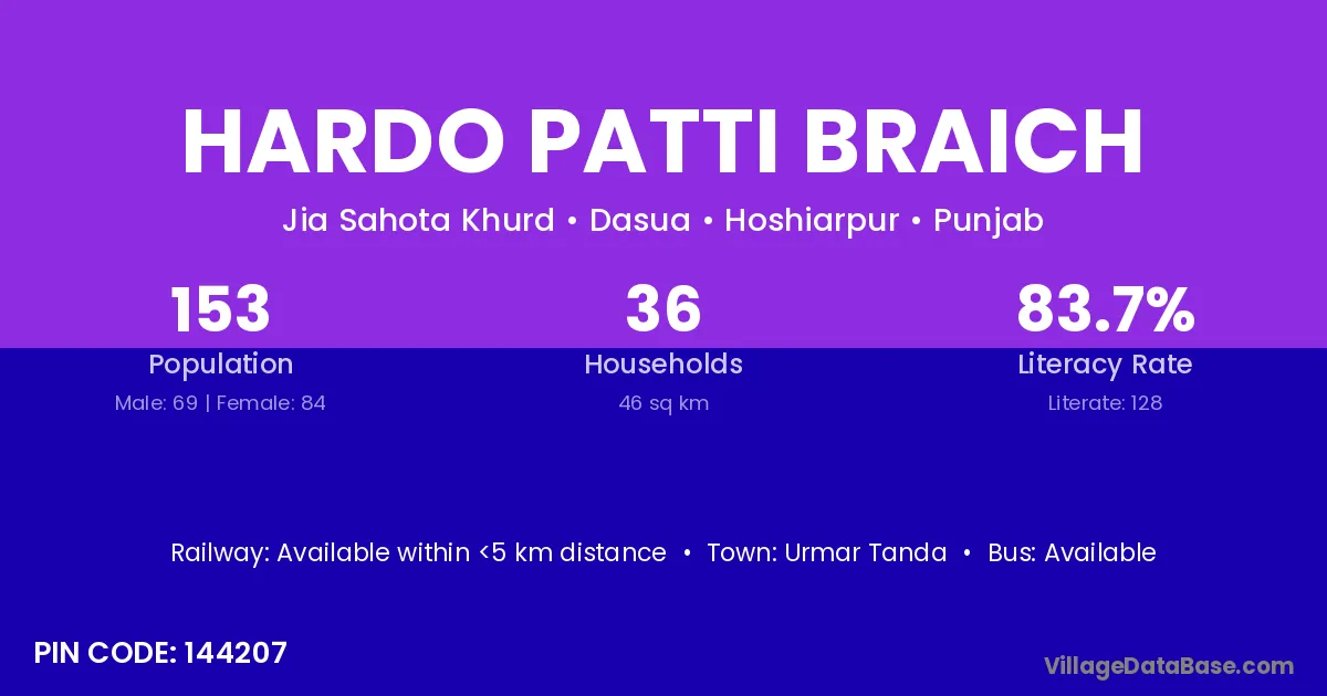Hardo Patti Braich village has a total population of 153 people, of which 69 are males and 84 are females.