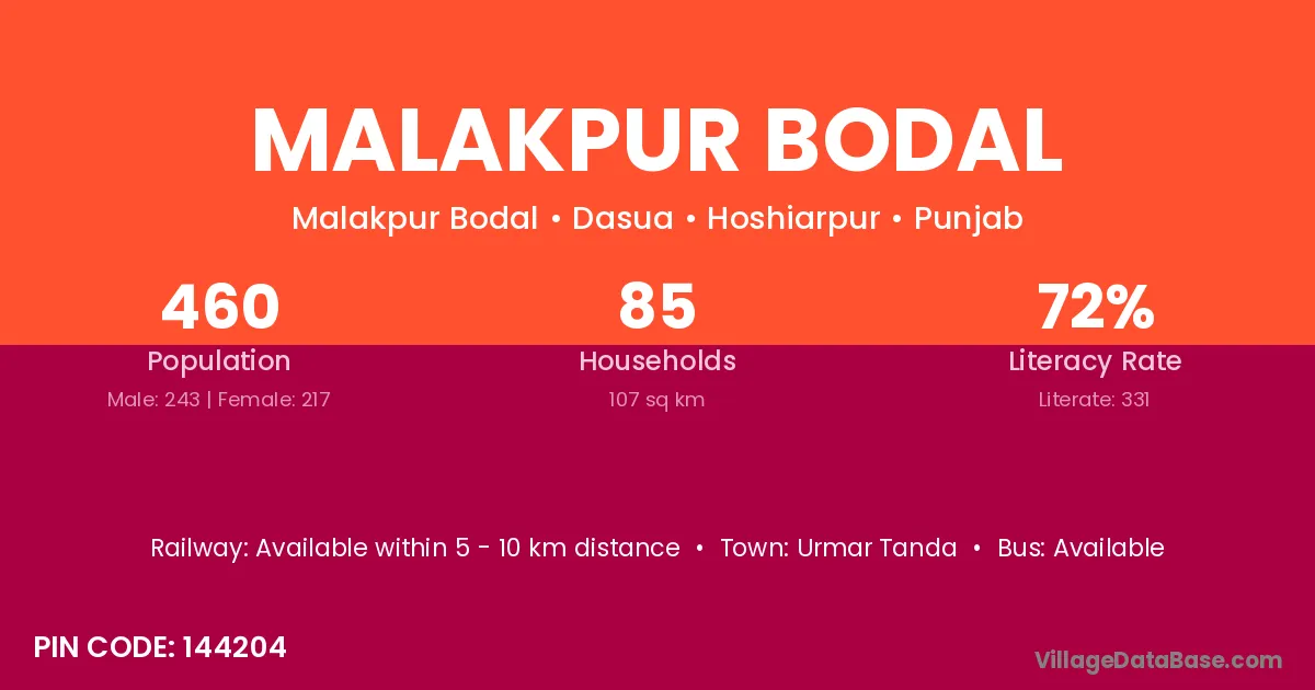 Urmar Tanda is the nearest town to Malakpur Bodal village for major economic activities