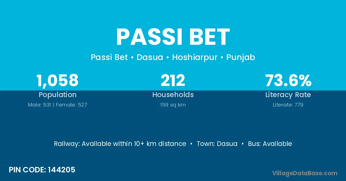 Passi Bet village has a total population of 1,058 people, of which 531 are males and 527 are females.