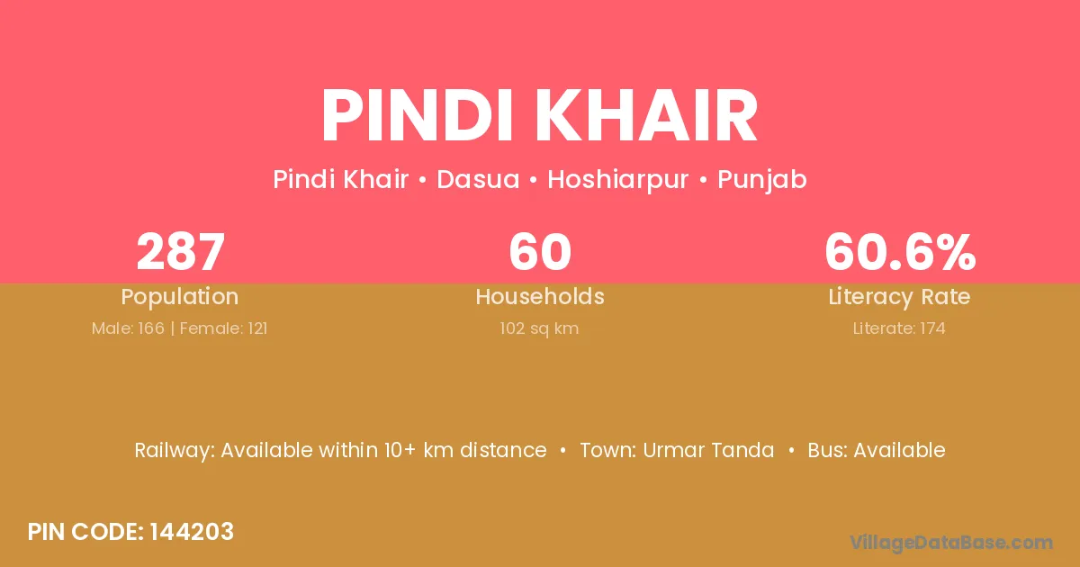 Pindi Khair village has a total population of 287 people, of which 166 are males and 121 are females.