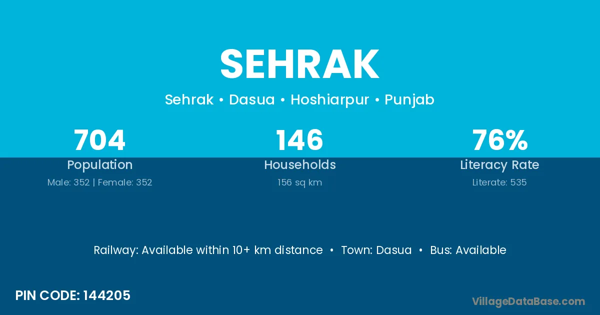 Sehrak village has a total population of 704 people, of which 352 are males and 352 are females.