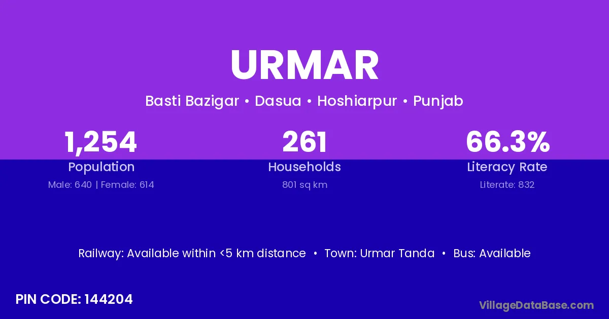 Urmar village has a total population of 1,254 people, of which 640 are males and 614 are females.