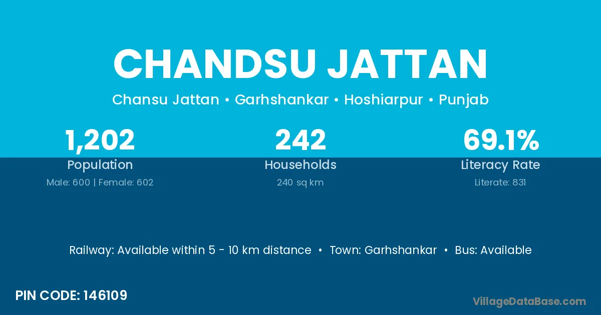 Chandsu Jattan village has a total population of 1,202 people, of which 600 are males and 602 are females.
