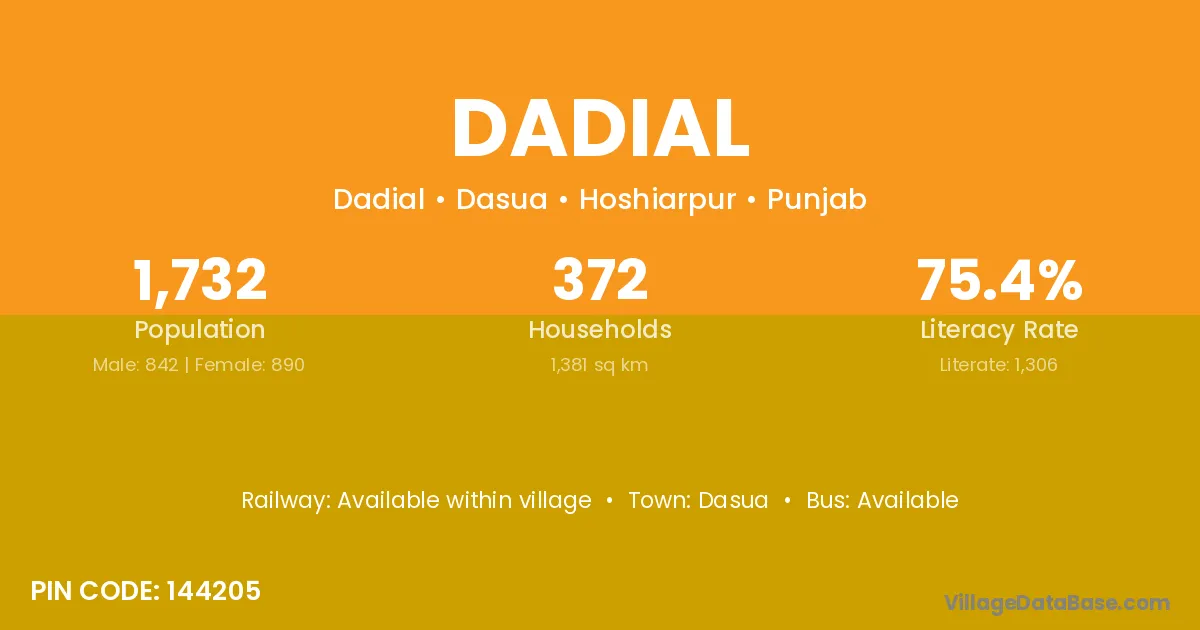 According to Census 2011 information, the village code of Dadial village is 144529.