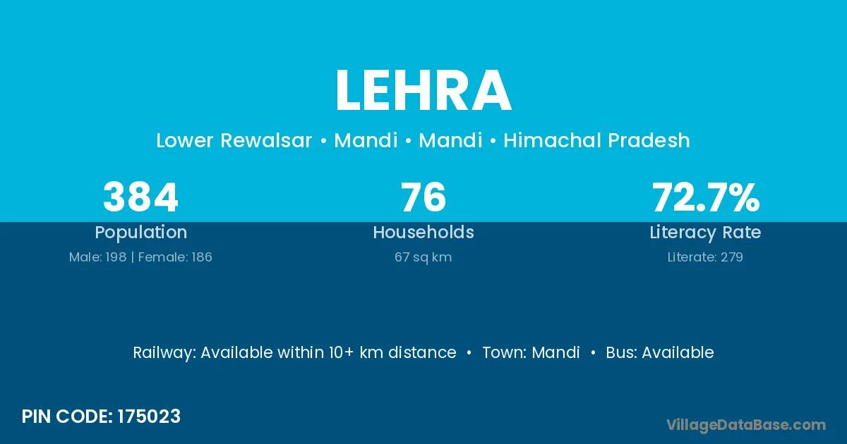 The literacy rate of Lehra village is 68.65%. Male literacy stands at 75.28% and female literacy at 61.94%.
