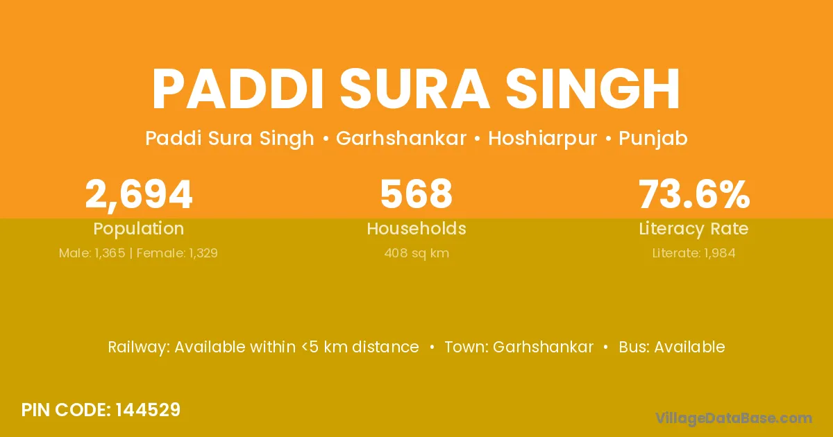 Paddi Sura Singh village has a total population of 2,694 people, of which 1,365 are males and 1,329 are females.