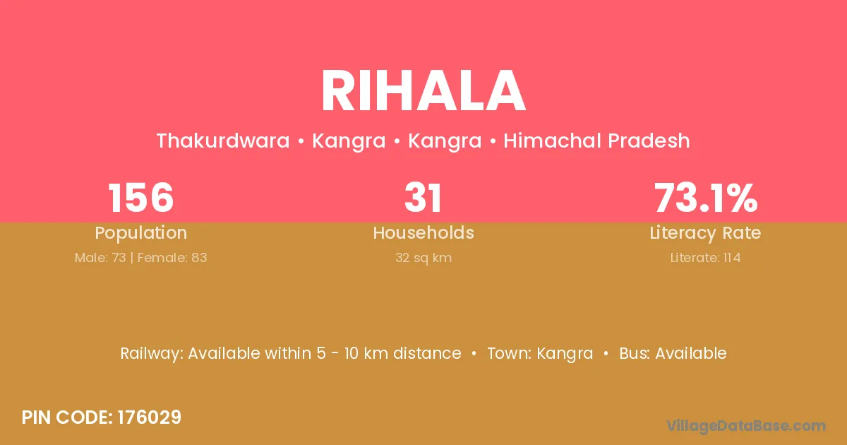 The literacy rate of Rihala village is 71.26%. Male literacy stands at 73.44% and female literacy at 68.96%.