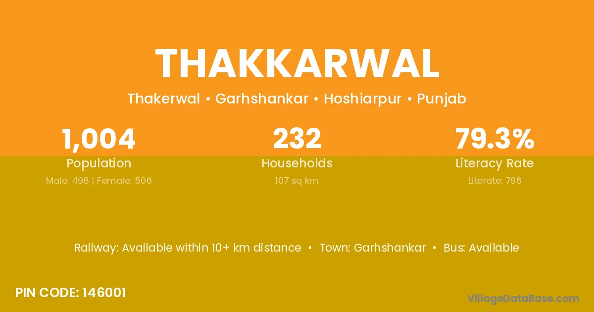 Thakkarwal village has a total population of 1,004 people, of which 498 are males and 506 are females.
