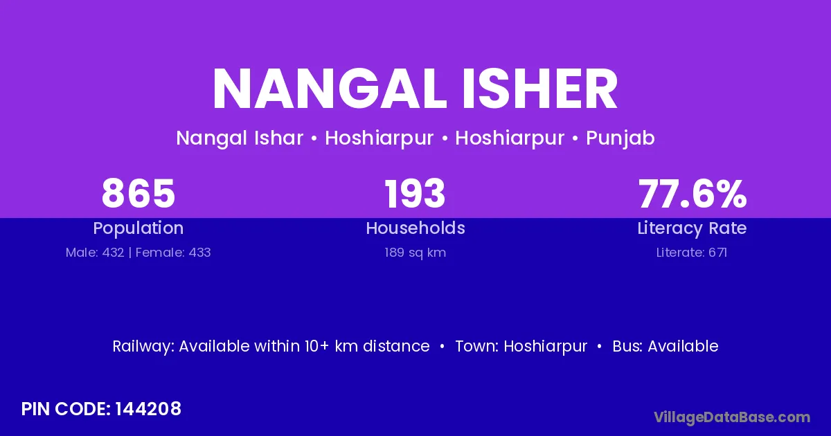 Nangal Isher village has a total population of 865 people, of which 432 are males and 433 are females.