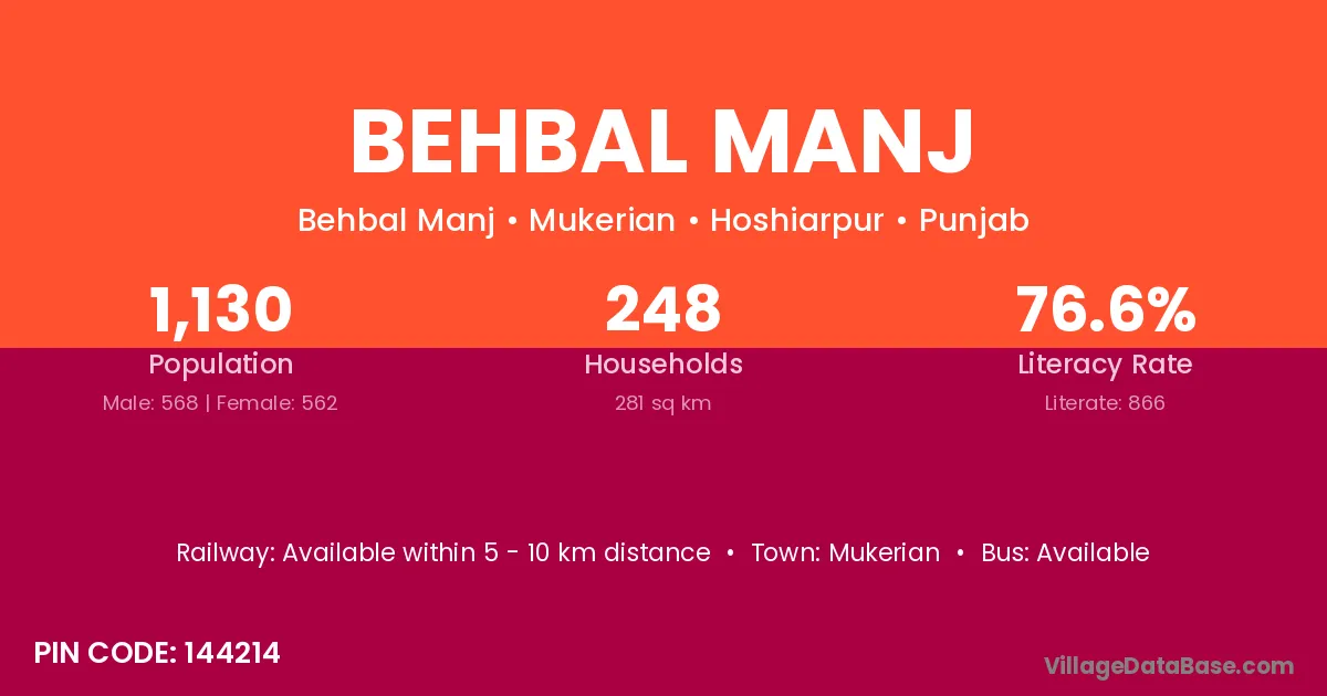 Behbal Manj village has a total population of 1,130 people, of which 568 are males and 562 are females.