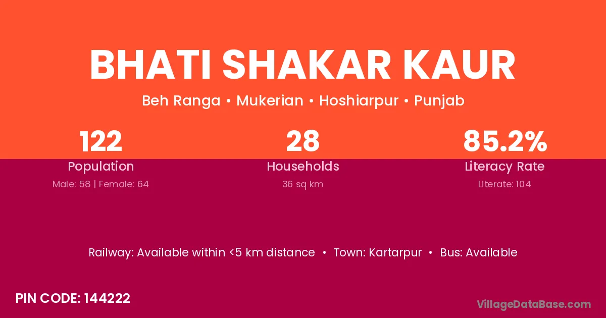 Bhati Shakar Kaur village has a total population of 122 people, of which 58 are males and 64 are females.