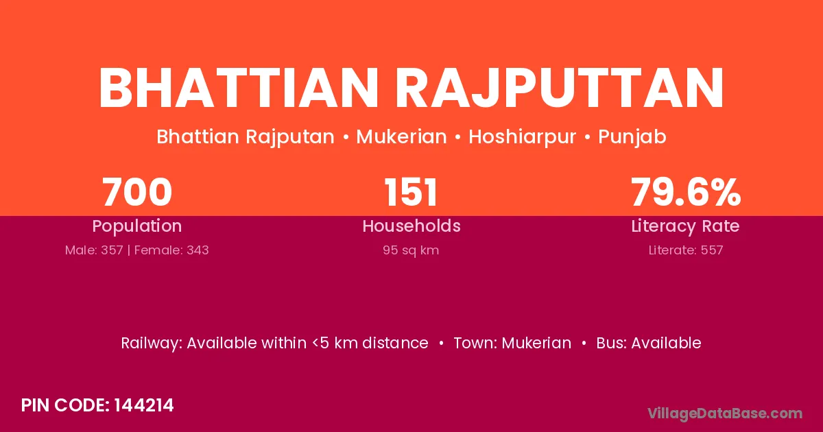 Bhattian Rajputtan village has a total population of 700 people, of which 357 are males and 343 are females.
