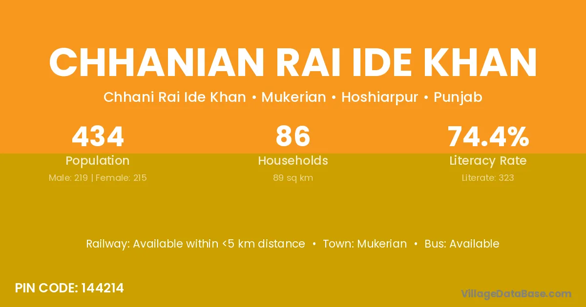 Chhanian Rai Ide Khan village has a total population of 434 people, of which 219 are males and 215 are females.