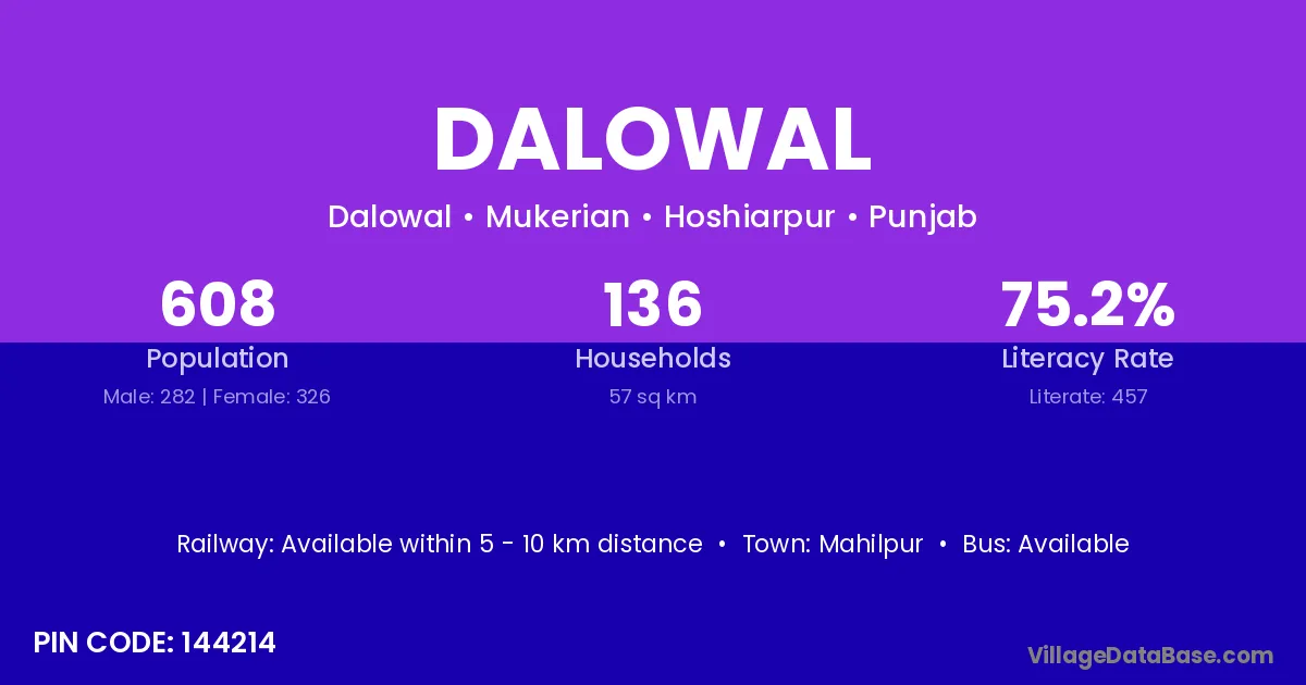 Dalowal village has a total population of 608 people, of which 282 are males and 326 are females.