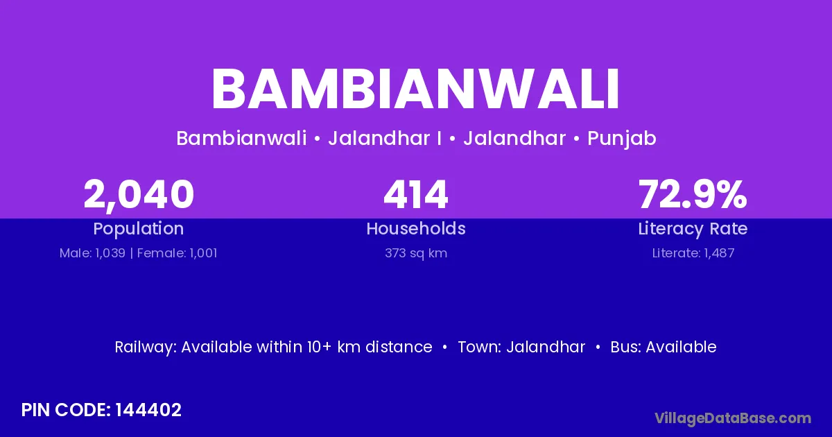 Bambianwali village has a total population of 2,040 people, of which 1,039 are males and 1,001 are females.